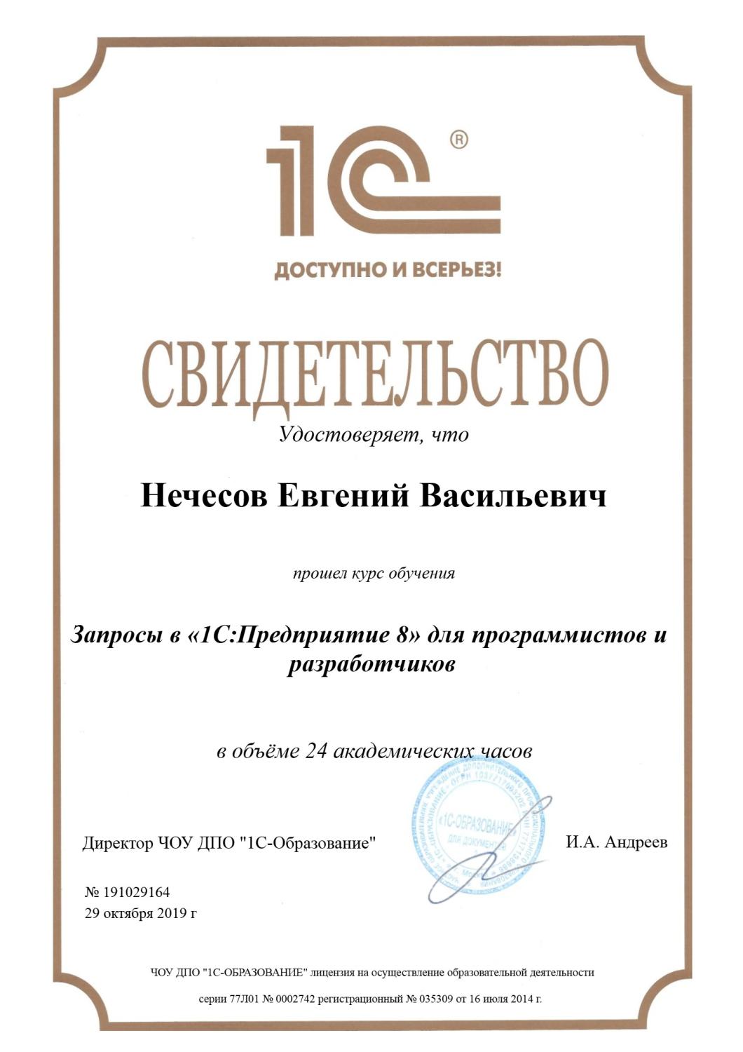 Свидетельство о прохождении курса «Запросы в 1С для программистов и разработчиков»