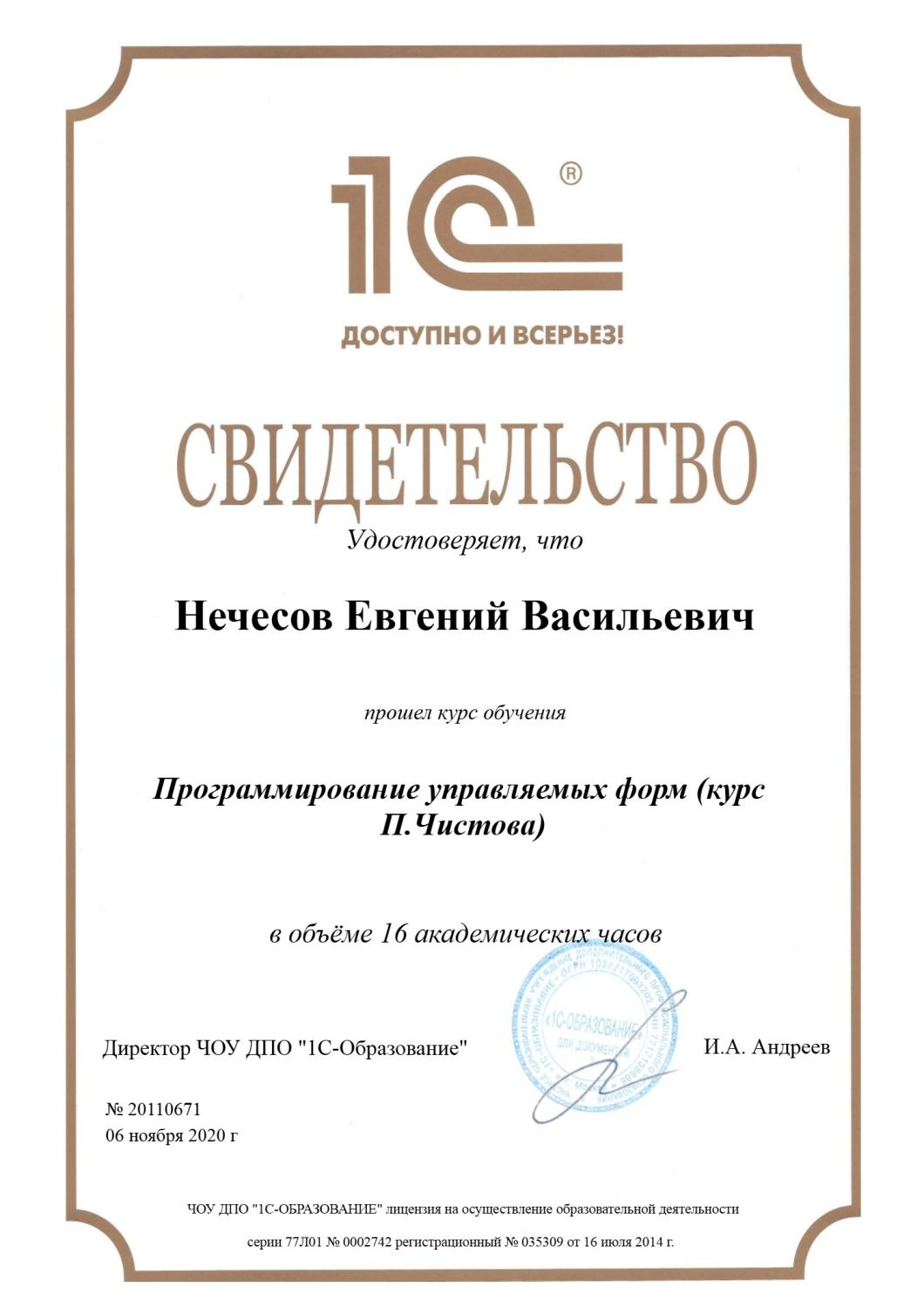 Свидетельство о прохождении курса «Программирование управляемых форм»