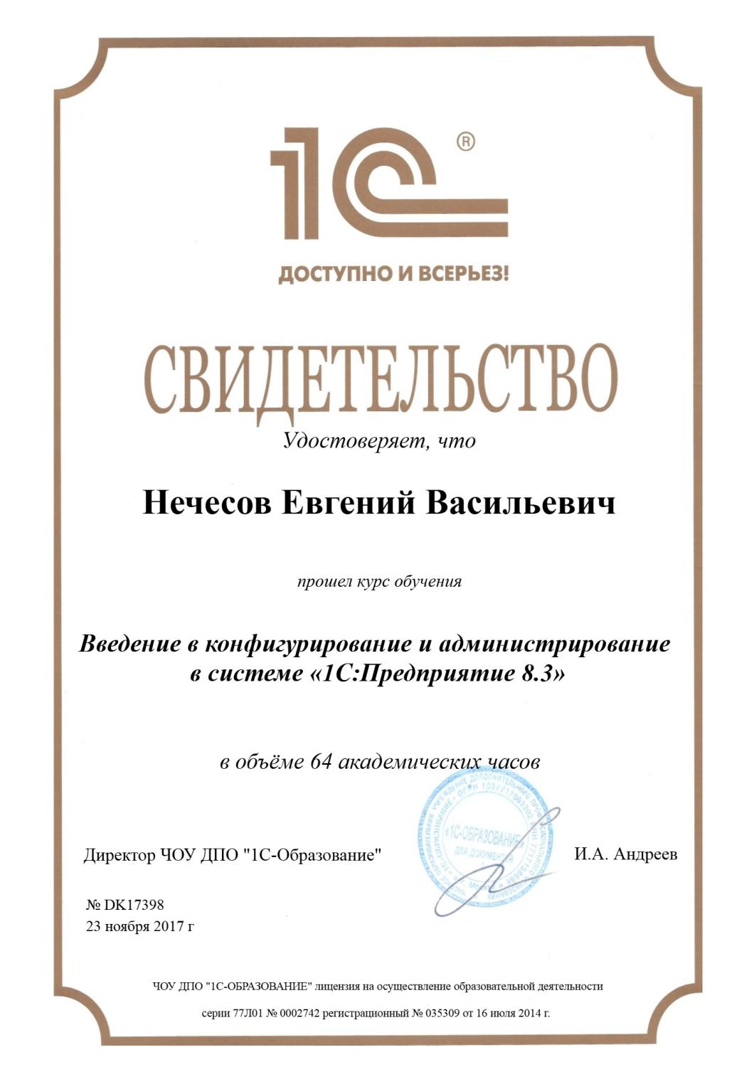 Свидетельство о прохождении курса «Конфигурирование и администрирование в 1С»