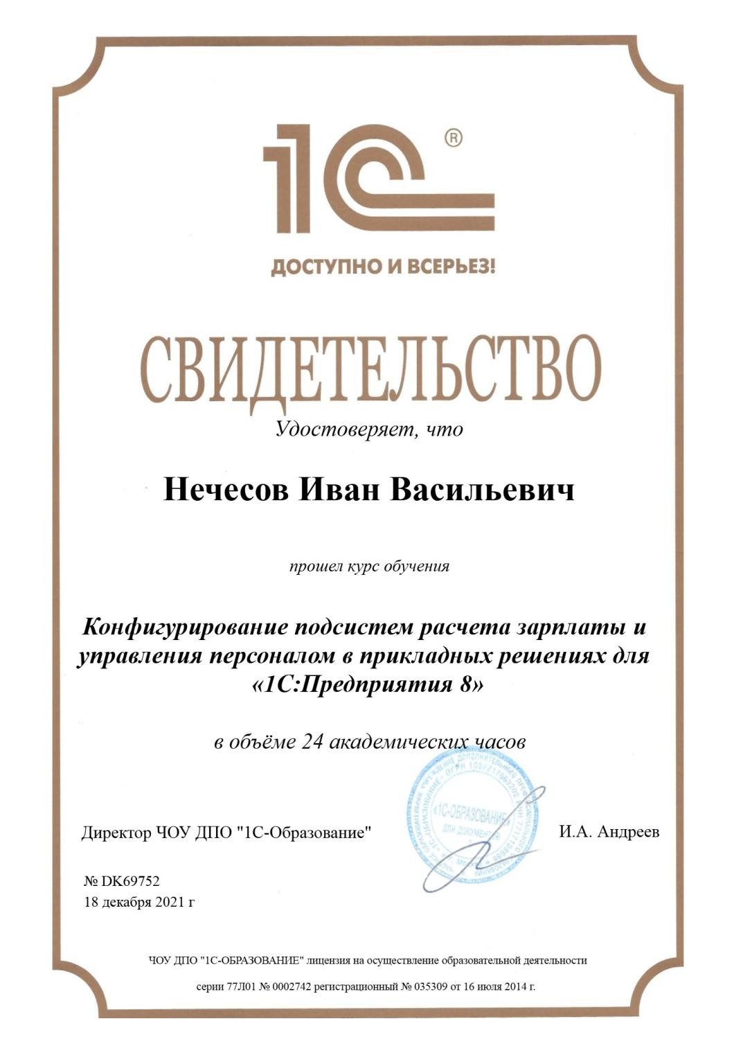 Свидетельство о прохождении курса «Конфигурирование подсистем расчета зарплаты и управления персоналом»